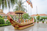 At early afternoon it didn´t make sense to go to Angkor Wat on our first day, so we decided to stay inside Siem Reap and take a look at some of its attractions. The hotel arranged a Tuk-tuk and off we went! Our first stop was actually a shop to buy sunscreen. With more than 30 degrees it was searing hot and sunny in Siem Reap, and our sunscreen was in my lost bag. To our surprise, it cost more than the double of what I have paid in Germany for the sunscreen. Siem Reap isn´t necessarily a cheap place to buy tourist stuff, we learned. However, the next stop was much more pleasing - Wat Preah Prom Rath. It is a pretty and peaceful complex inside the city with fascinating sculptures.