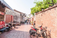 When the ceremony proceeded, we walked towards the Nine-Turns-Lane. Opposite the entrance to the lane was an interesting building, that however looked out of place there. We followed the alley through old Taiwanese houses and came out at the Minzu Road, where we walked further north and had a drinking break.