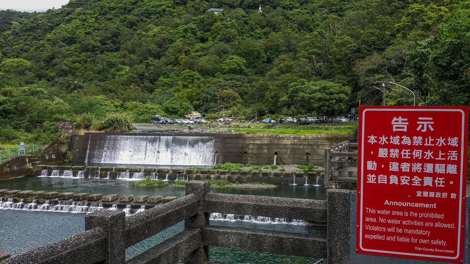 From the hotel, we walked to the Jiaoxi Train Station. From there the "Jiaoxi Route" of the Taiwan Tourist Shuttle departs. The Tourist Shuttle is a rather cheap bus that goes to the main tourist attractions in and around Jiaoxi with frequent departures every day. We exited the bus at the Wufengqi Scenic Area bus stop and walked from the parking lot, which has restrooms and some seats, to a water reservoir, from where the trail to a waterfall started. The Wufengqi Falls are actually three waterfalls, all connected by a hiking trail.